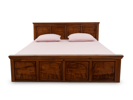 Elephant Carving Solid Sheesham Wood Bed With Box Storage (King Size, Honey Finish)
