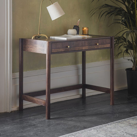 Suryavanshi Modern Writing Desk with Decorative Drawer Front, Dark Wood Finish, Brass Hardware(Walnut Finish)