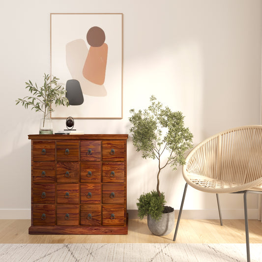 Suryavanshi Sheesham Wood Brown 16 Drawer Storage Unit with Metal Ring Handles ( 30D x 83W x 90H Centimeters)