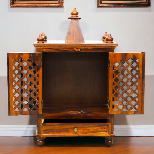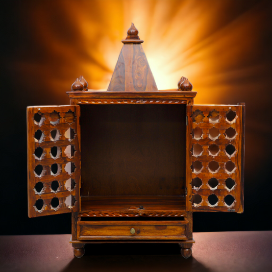Suryavanshi Sheesham Wood Temple with 1 Drawer, 2 Doors, and CNC Work – A Divine Sanctuary of Elegance
