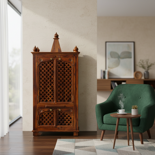 Suryavanshi Sheesham Wood Temple with 1 Drawer, 2 Doors, and CNC Work – A Divine Sanctuary of Elegance