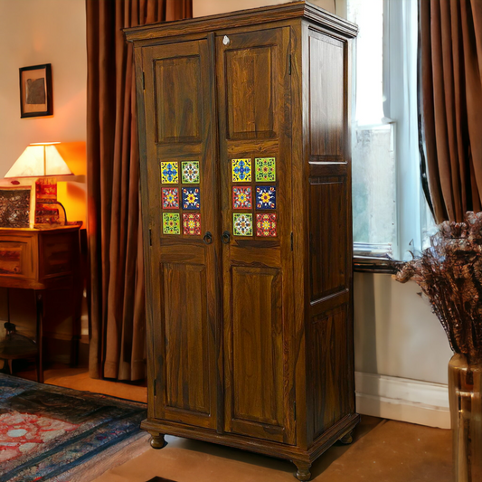 Suryavanshi Sheesham Wood 2 Door Wardrobe - Pottery Tiles, Ample Storage, and Elegant Design, Wooden Cabinet, Wooden Storage Cabinet, 55D x 91W x 196H Cm