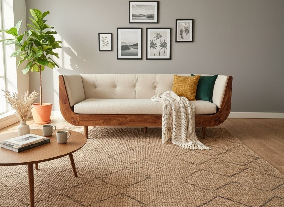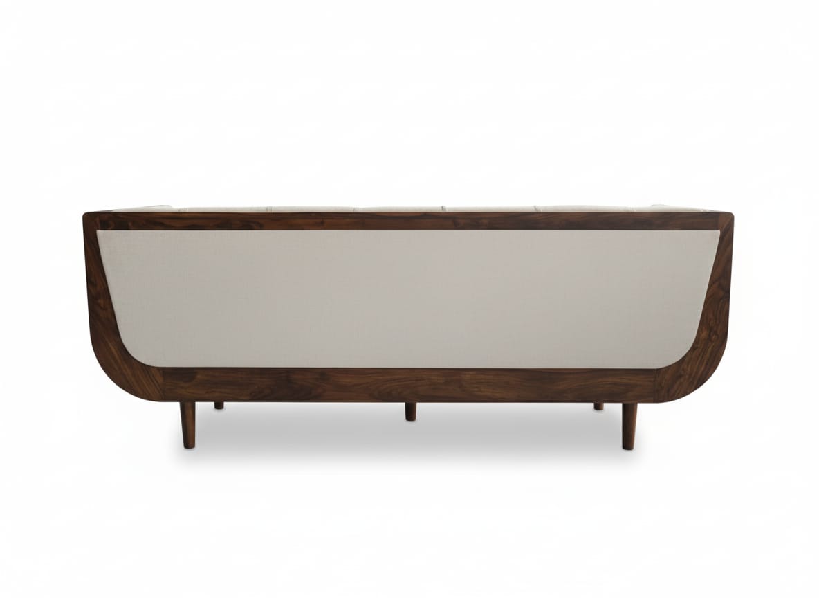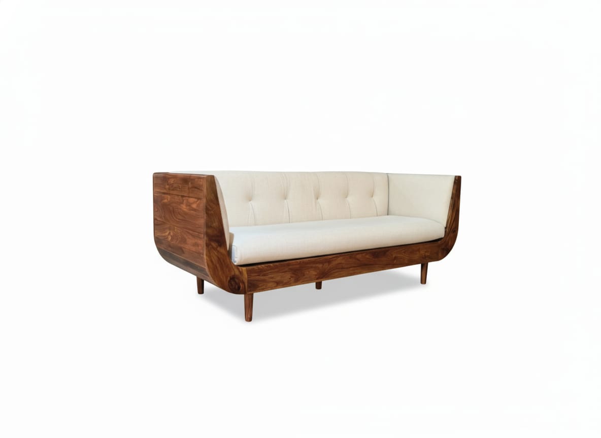 BOAT Sheesham Wood Sofa with Cream Velvet Upholstery – Modern Solid Wood 3-Seater (Honey Finish)