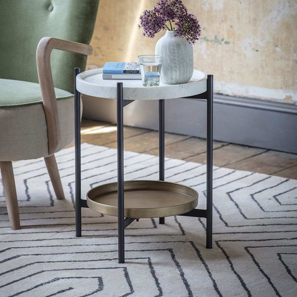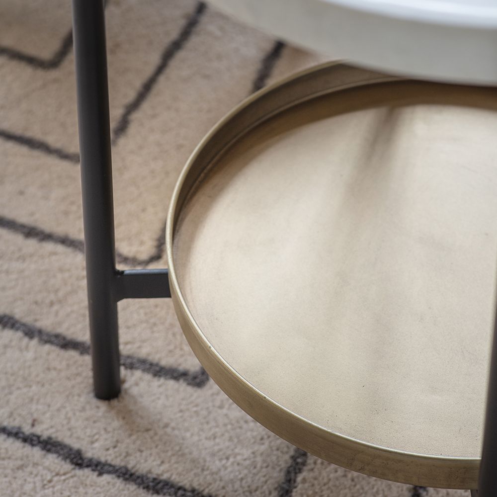 Suryavanshi Brooklyn Marble Top Side Table - Black Iron Legs, Brass Shelf, Circular Shape