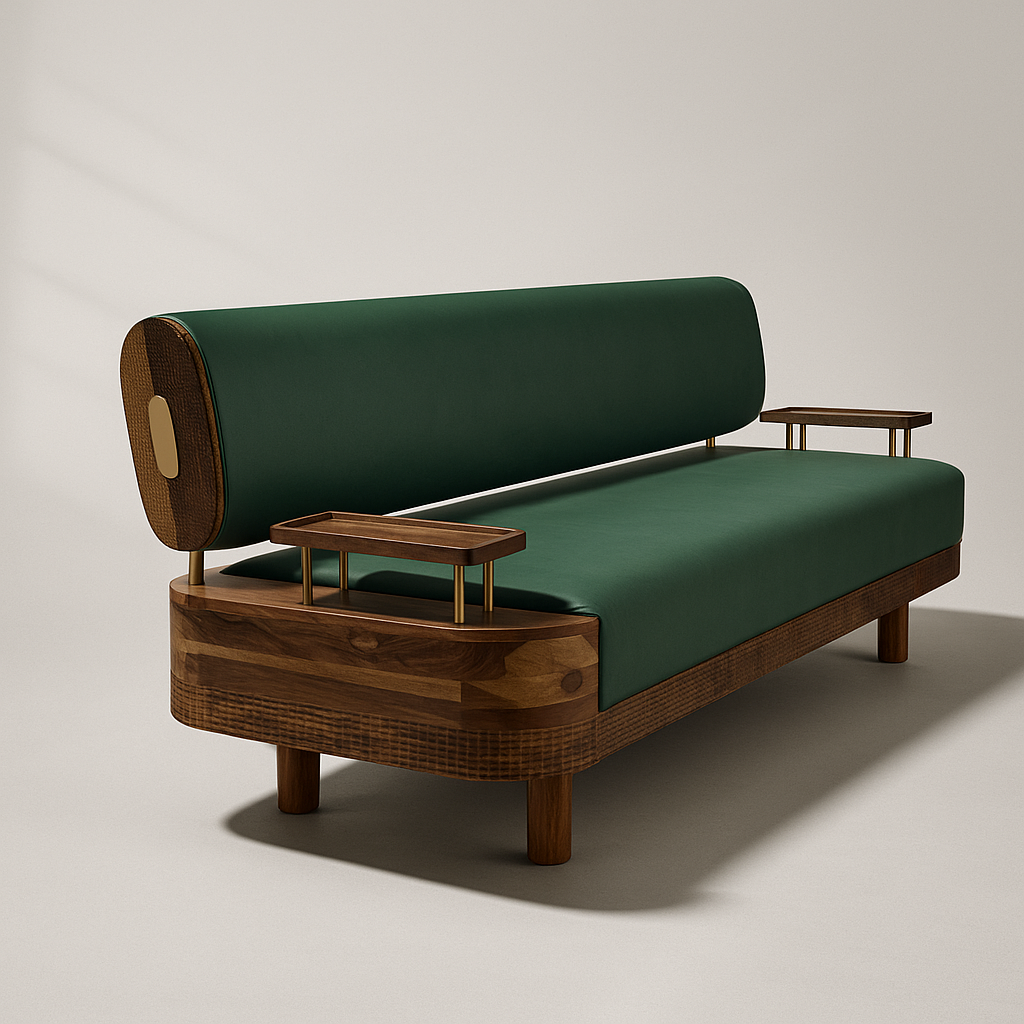 Suryavanshi Sofa, a stunning piece crafted from Sheesham with intricate details. The backrest features brass inlay, while the handrest serves multiple purposes with the handrest serves multiple purposes with chiseled edges and a tray-like top supported by brass legs. The seat's bottom part is also handcrafted with chisel details, making this sofa truly one-of-a-kind.