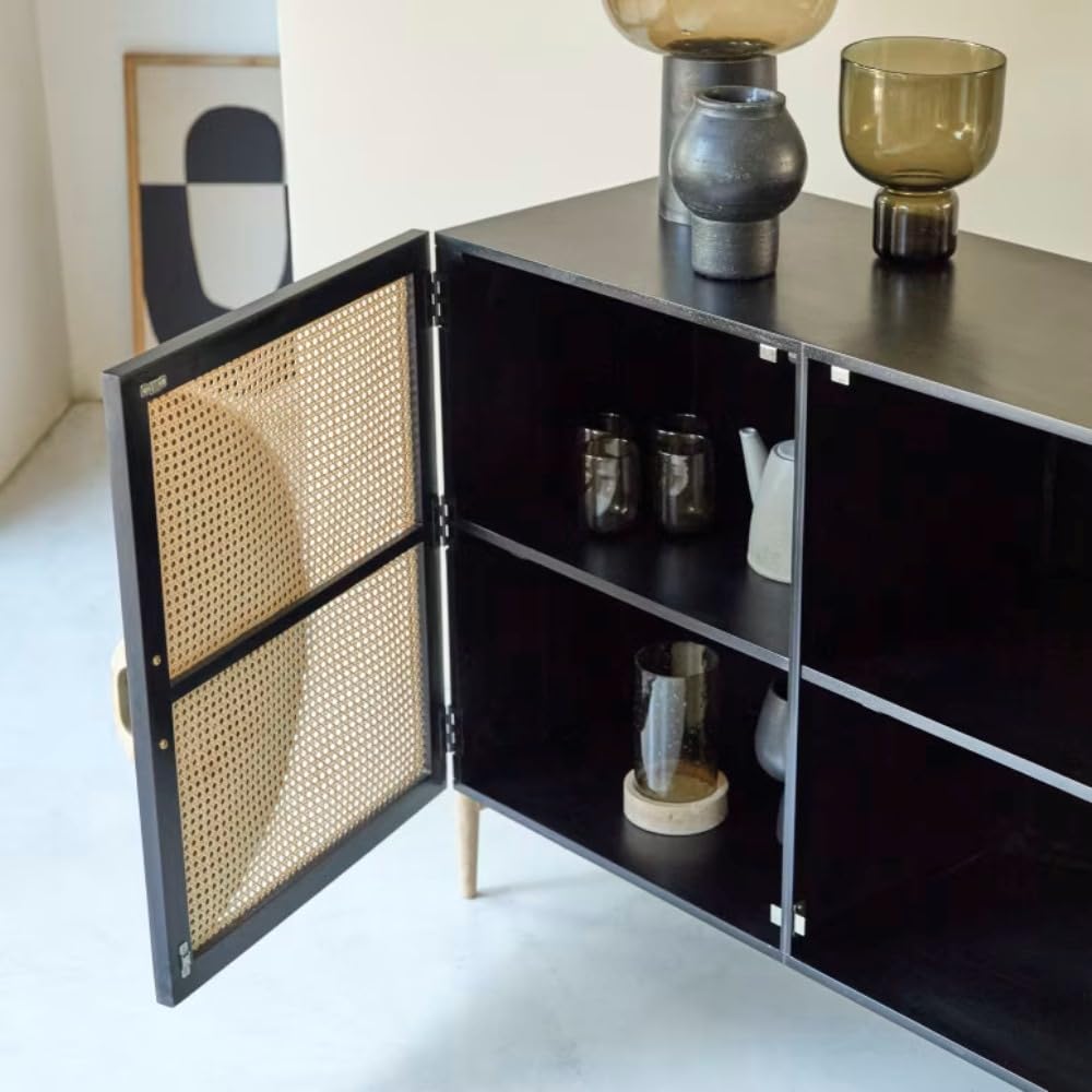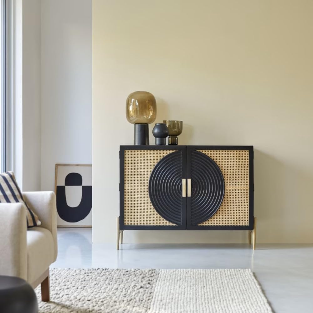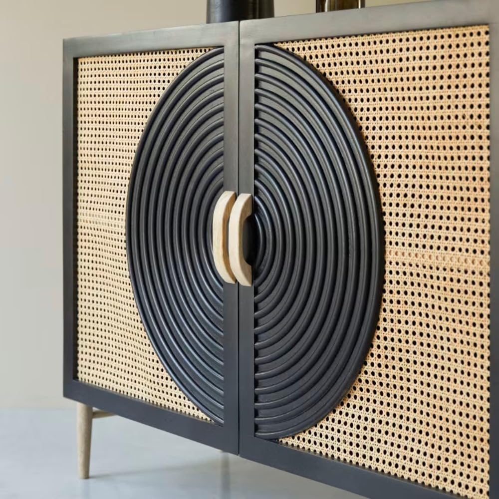 Suryavanshi Mango Wood Sideboard – Spiral Carving, Rattan Work on 2 Doors (Carving-Rattan, W114 D45.5 H90 cm)