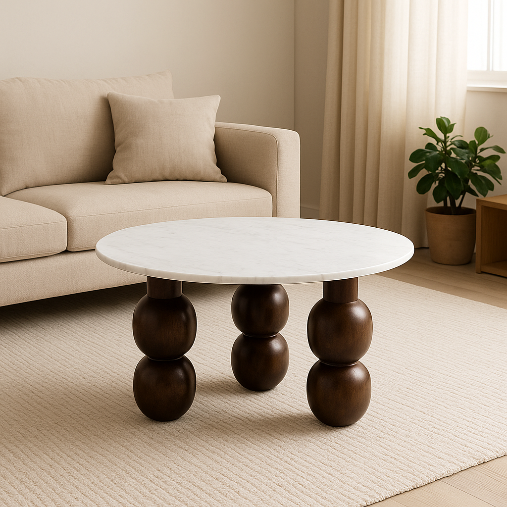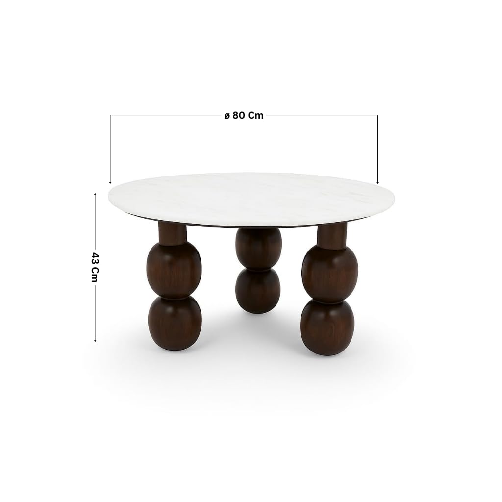 Suryavanshi Premium Round Center Table with Banswara White Marble Top & Solid Wood Ball Legs ā Modern Coffee Table