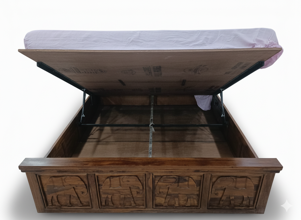 Elephant Carving Solid Sheesham Wood Bed With Box Storage (King Size, Honey Finish)