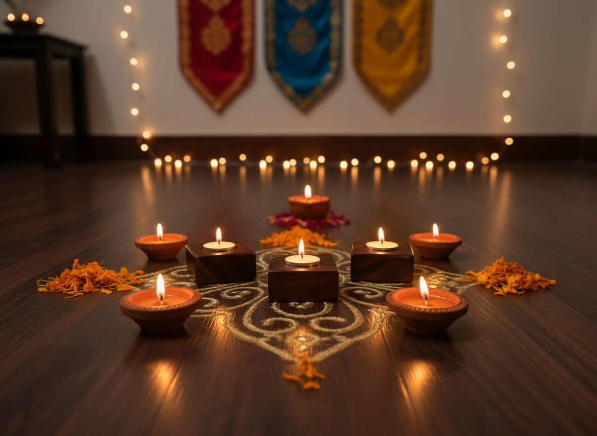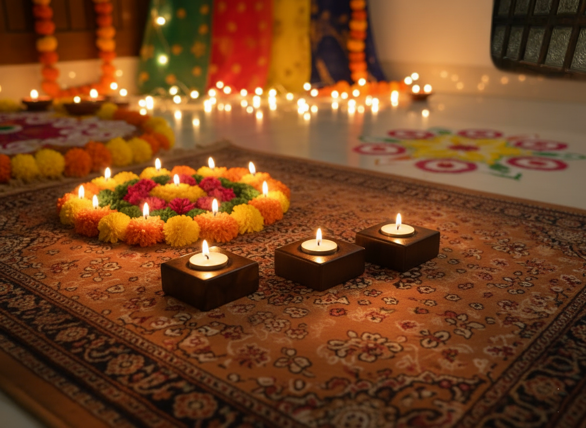 Wooden Set of 3 Candle Stands with Candles – Elegant Home & Festive Décor